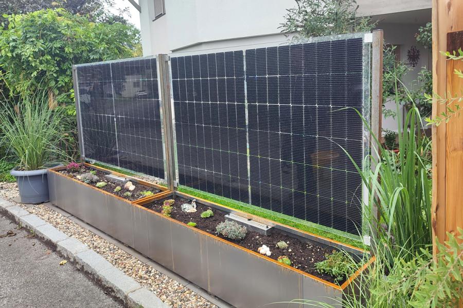 Diese innovative Lösung bietet Ihnen mehr als nur eine Abgrenzung für Ihre Terrasse oder Ihren Garten. Nutzen Sie unsere Solarmodule als Zaunelement oder als modernen Sichtschutz, der nicht nur Strom erzeugt, sondern optional auch einen integrierten Pflanzkasten hat. Vielseitig einsetzbar, ästhetisch ansprechend und mit einfacher Handhabung: Sie brauchen nur eine einzige Steckdose.