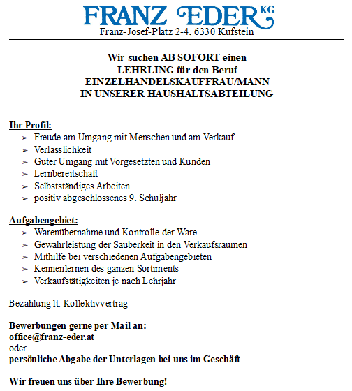 Über deine Bewerbung unter office@franz-eder.at oder direkt im Geschäft
