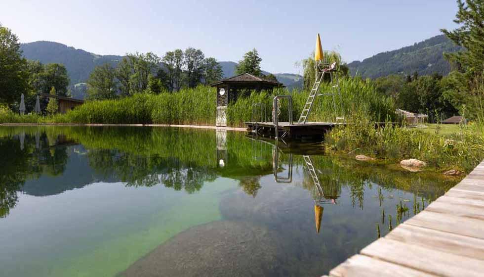 Bioschwimmteich mit 1m- und 3m-Sprungturm.