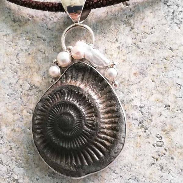 Ammonit Anhänger 925 Silber - Fossilien mit Zuchtperle