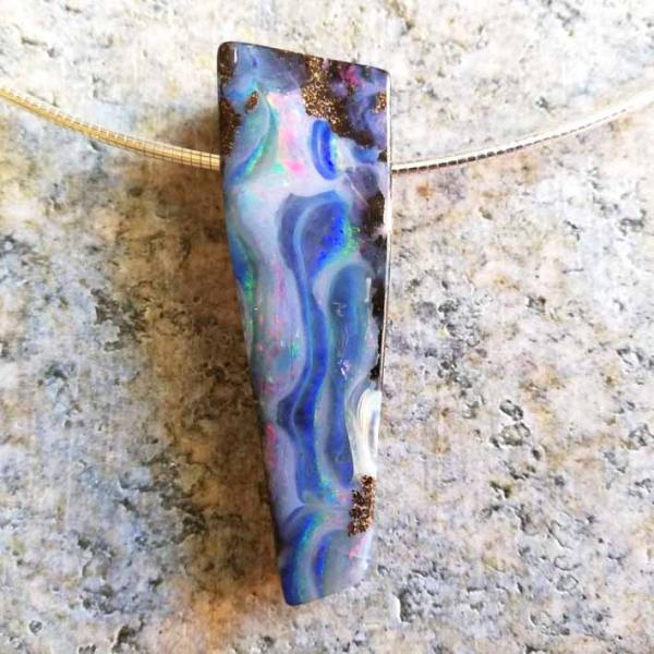 Opal aus Quennsland Australien: Länge 56 mm x Breite 18 mm x Tiefe 12 mm, Qualität A. Gewicht 102 Karat. Seitlich gebohrt für Kette.