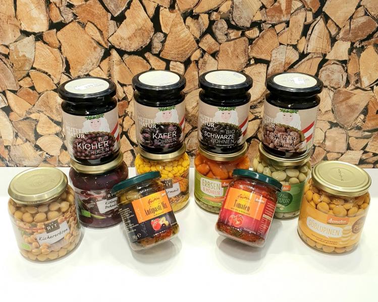 Mais, Bohnen, Kichererbsen, Lupinen, Linsen und vieles mehr im Glas, selbstverständlich in Bio-Qualität
