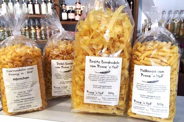 Die Eiernudeln vom Pranz`n Hof werden in handwerklicher Tradition aus hofeigenen Eiern und hochwertigem Dinkel- oder Hartweizengrieß hergestellt, schonend getrocknet und verpackt -