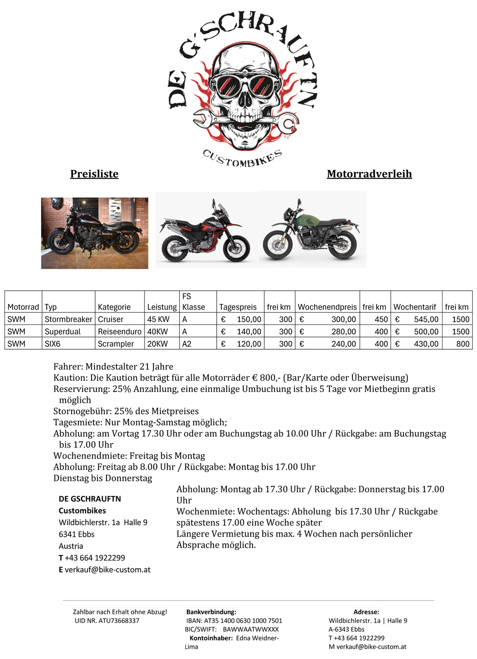 Da ich immer wieder im Außendienst bin - bitte vorher anrufen!Erlebe die atemberaubende Bergwelt Tirols auf einer unserer hochwertigen SWM Motorräder! Egal, ob du einen Tagestrip, ein actionreiches Wochenende oder eine ganze Woche voller Freiheit planst – bei uns findest du das perfekte Bike für dein unvergessliches Fahrerlebnis.