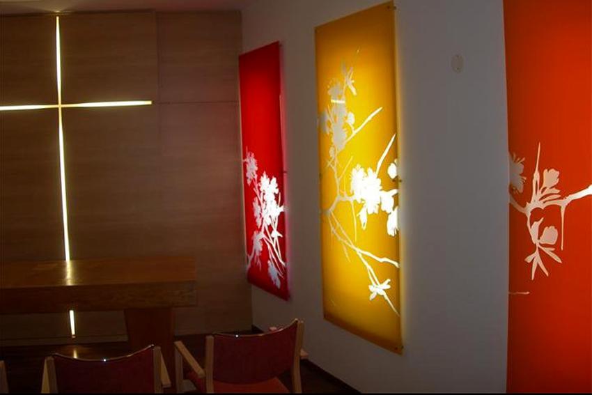 In dieser Kapelle schafft gedämpftes Tageslicht Atmosphäre. In der Nacht werden die Scheiben hinterleuchtet.