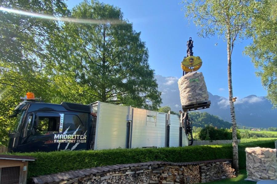Das Brennholz kann auf der Palette in Ihren Garten, auf den Balkon oder die Dachterrasse gehoben werden.