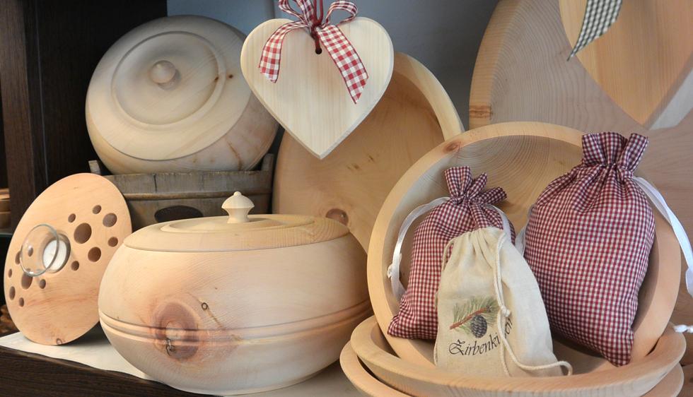 Zirbenschalen, Brotdosen aus Zirbe, Stöpsel & Kugeln für Karaffen, Zirbenherzen, Zirbenkissen, Öle zum Auffrischen uvm.