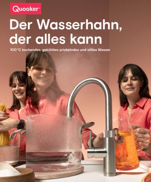 Der Quooker-Hahn wurde allgemein als Kochend-Wasserhahn bekannt. Heute kann ein Quooker viel mehr als nur 100°C kochendes Wasser. Zum Beispiel kann der Quooker warmes, kaltes und kochendes Wasser aus einem einzigen Hahn liefern. Mit der Erfindung des Cubes gibt es auch gekühltes stilles und prickelndes Wasser. Deshalb wird der Quooker auch “der Wasserhahn, der alles kann” genannt.