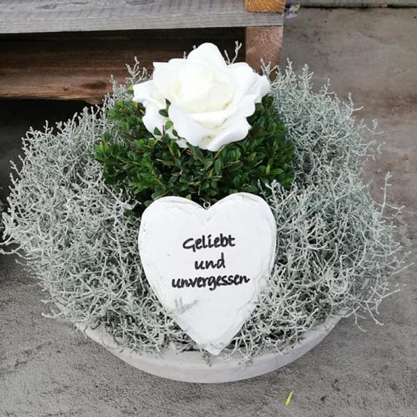 - Herzgestecke: Blumenarrangements in Herzform, die die Urne umrahmen oder daneben platziert werden.