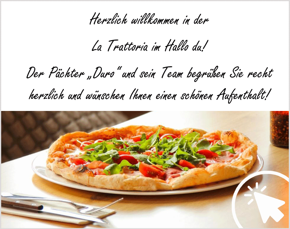 Beginnen Sie mit leichten Vorspeisen und knackigen Salaten. Probieren Sie unbedingt unsere knusprigen Pizzen und die feinen Pasta-Gerichte. Für den großen Hunger bieten wir auch Fleisch- und Fischgerichte an.
