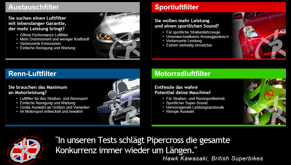 Ob für Motorrad oder für Ihr Auto, Pipercross bietet ein umfangreiches Sortiment an Luftfiltern für Ihr Fahrzeug.