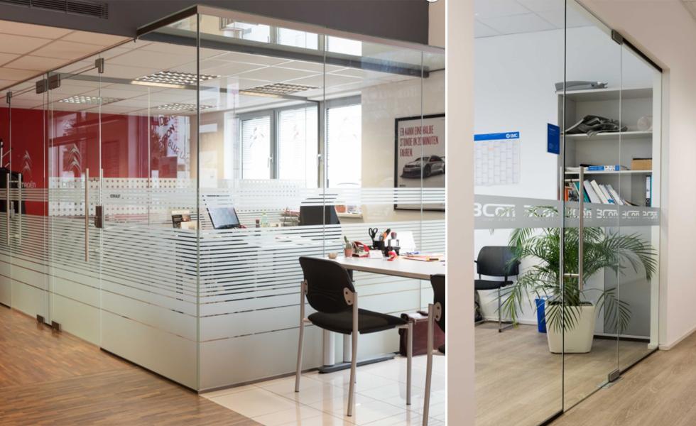 Glas klar, satiniert ("Milchglas" als Sichtschutz), bedruckt (Digitaldruck, versch. Motive), gemustert (Gravuren, etc.) Folienklebung