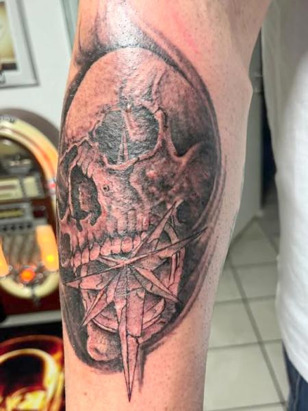 Tätowierungen mit Schädelmotiven, oft mit symbolischer Bedeutung für Tod, Vergänglichkeit oder Rebellion.
