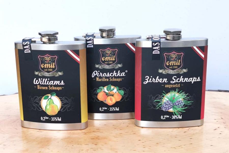 Der gefüllte Flachmann aus dem Hause Emil. Original Piroschka Marillenschnaps - ein Genuss für Marillenliebhaber.