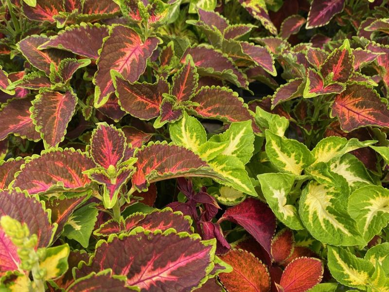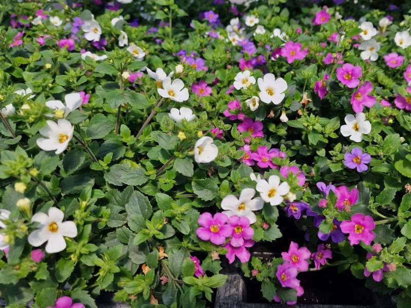 Schattenlieschen/fleißige Lieschen (Impatiens walleriana), Schneeflockenblume (Bacopa), Knollenbegonien, Buntnessel, Punktblume (Hypoestes phyllostachya)