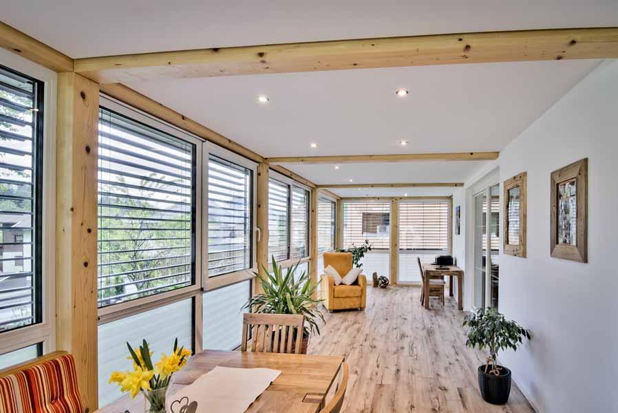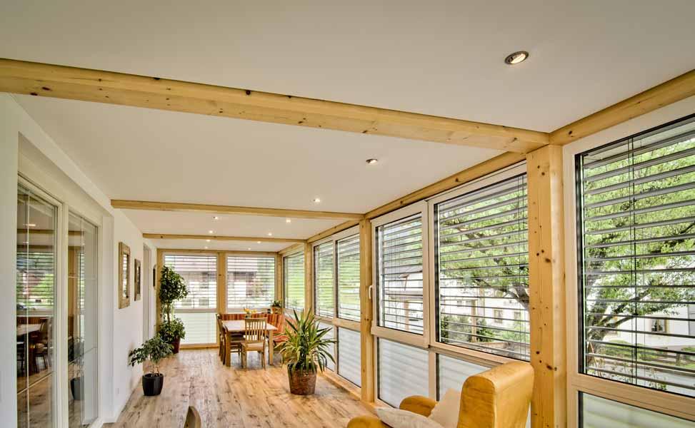 Ein Wintergarten als lichtdurchfluteter Platz mit entspannten Sitz- und Liegegelegenheiten vereint Wohnlichkeit & Wärme und bietet einen besonders gemütlichen Aufenthaltsraum. Höchste Präzision der Holzelemente beim Übergang zu den Glasflächen zur Vermeidung von Feuchtigkeit, eine optimale Wärmedämmung mit effektiver Belüftungsmöglichkeit zur uneingeschränkten Nutzung des Bereiches im Sommer wie Winter und eine akkurate Holzrahmenkonstruktion bilden dabei die Vorgaben.