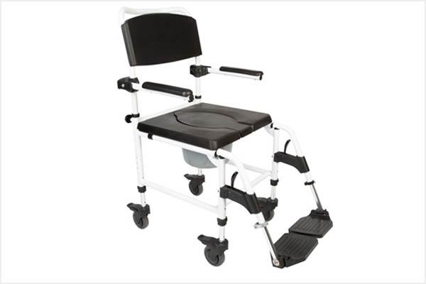 Der Dusch- und Toilettenrollstuhl Kakadu hat einen Rahmen aus weiß eloxiertem Aluminium und wird standardmäßig mit vier 5" Rädern mit Festellbremsen ausgeliefert. Der Sitz, der Rücken und die klappbaren Armlehnen bestehen aus schwarzem weichem PUR. Die Fußstützen sind höhenverstellbar und abnehmbar. Der Stuhl wird serienmäßig mit WC-Eimer, -Deckel und schwarzer Sitz-Abdeckung geliefert.