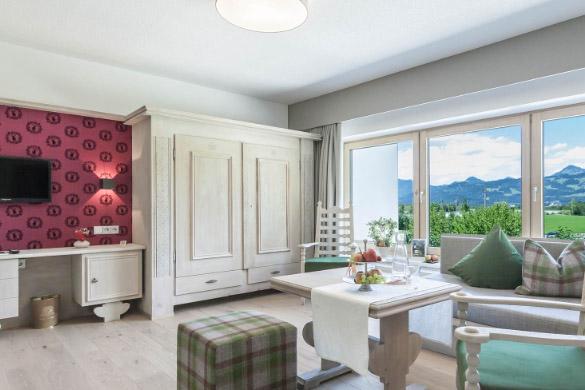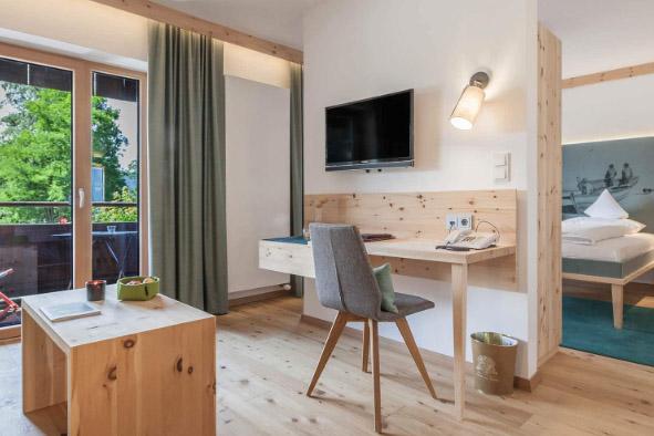 Moderne, lichtdurchflutete, luftige Familienzimmer mit Zirben Möbeln und Holzboden für 4 bis 6 Personen